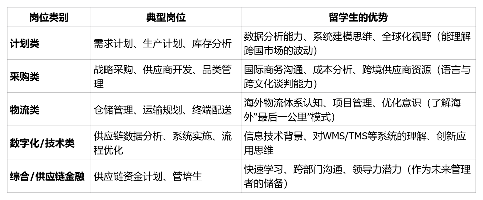 供应链行业的岗位挺多的,不同背景的留学生都能找到自己的位置。途鸽求职把常见的岗位类别和留学生的优势整理成了表格,方便你对号入座: