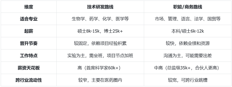 进了这个行业,以后能往哪走?生物医药行业的职业路径大致可以分为两条线:技术研发路线(适合生物学、药学、医学等专业背景)和职能/商务路线(适合市场、管理、语言等专业背景)。